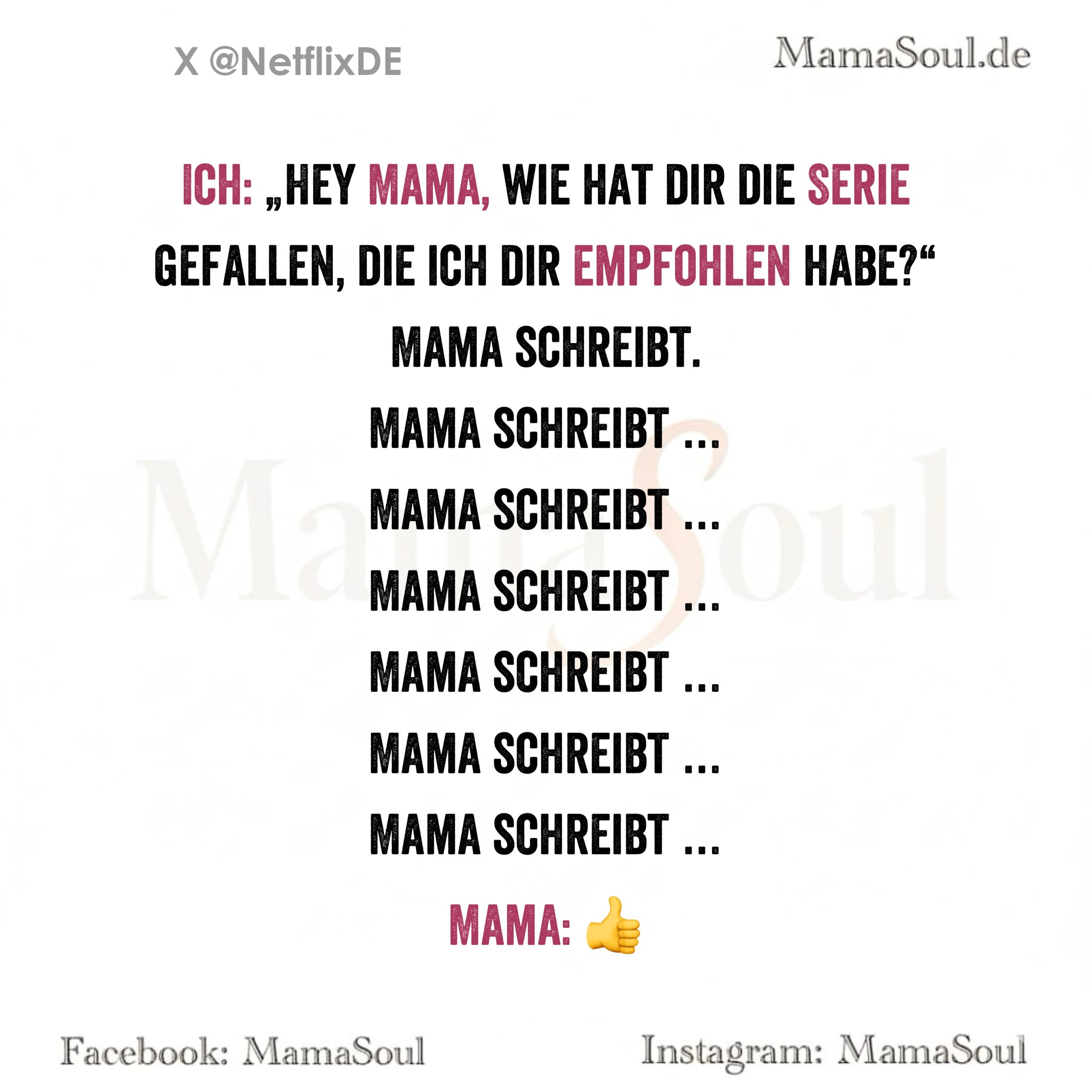 Ich: „Hey Mama, wie hat dir die Serie gefallen, die ich dir empfohlen habe?“ Mama schreibt. Mama schreibt … Mama schreibt … Mama schreibt … Mama schreibt … Mama schreibt … Mama schreibt … Mama: 👍