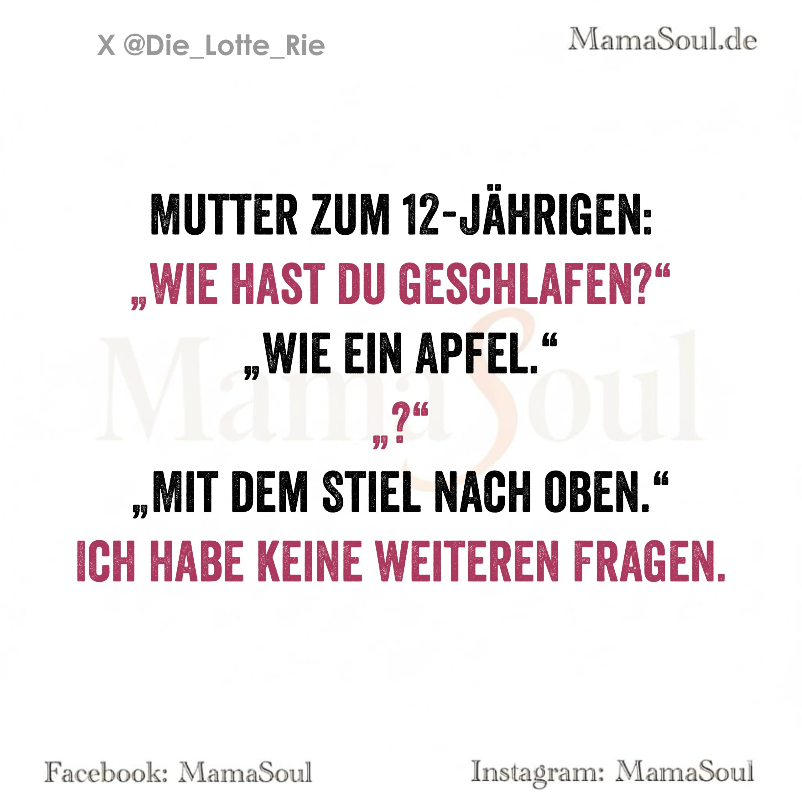 Mutter zum 12-Jährigen: „Wie hast du geschlafen?“ „Wie ein Apfel.“ „?“ „Mit dem Stiel nach oben.“ Ich habe keine weiteren Fragen.