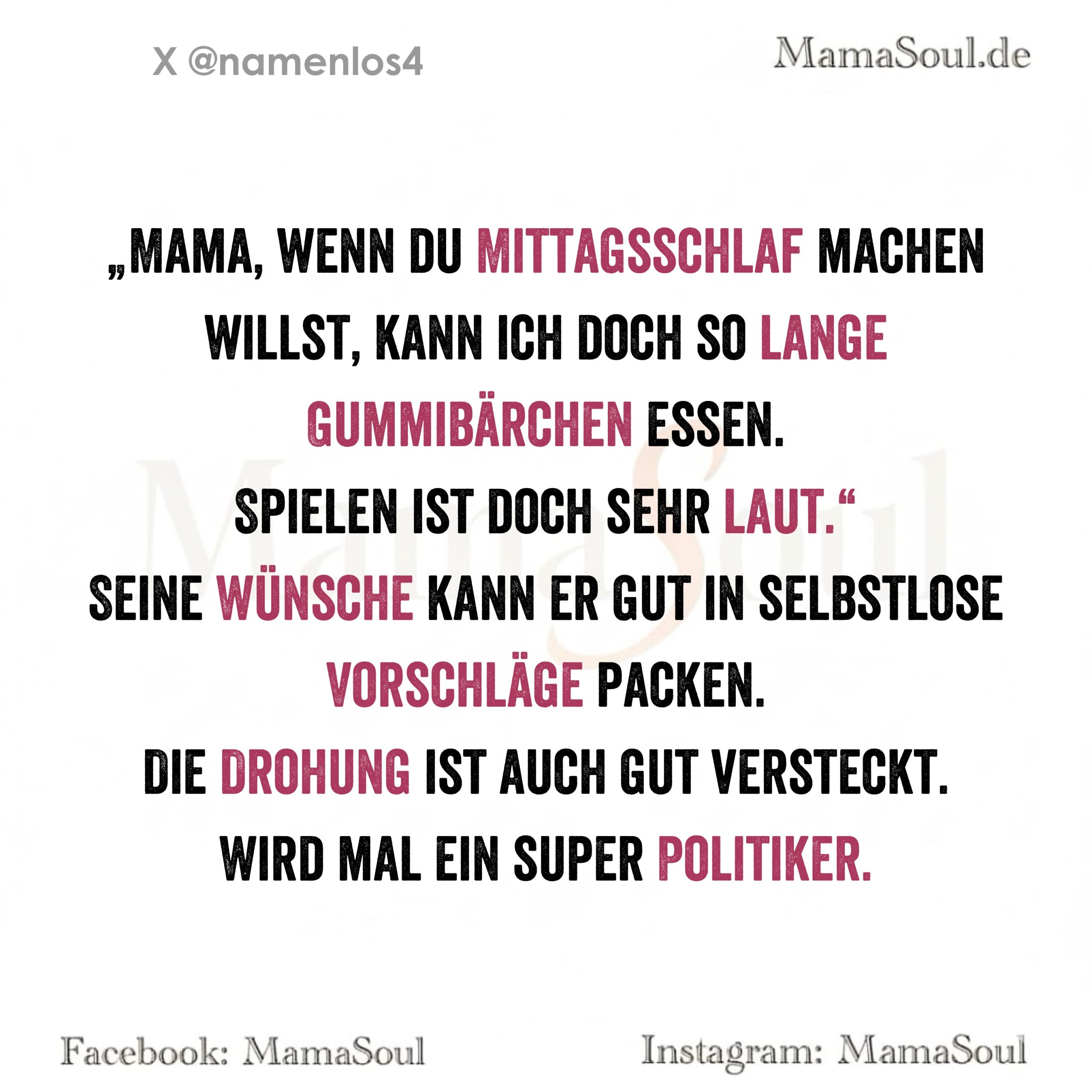 „Mama, wenn du Mittagsschlaf machen willst, kann ich doch so lange Gummibärchen essen. Spielen ist doch sehr laut.“ Seine Wünsche kann er gut in selbstlose Vorschläge packen. Die Drohung ist auch gut versteckt. Wird mal ein super Politiker.