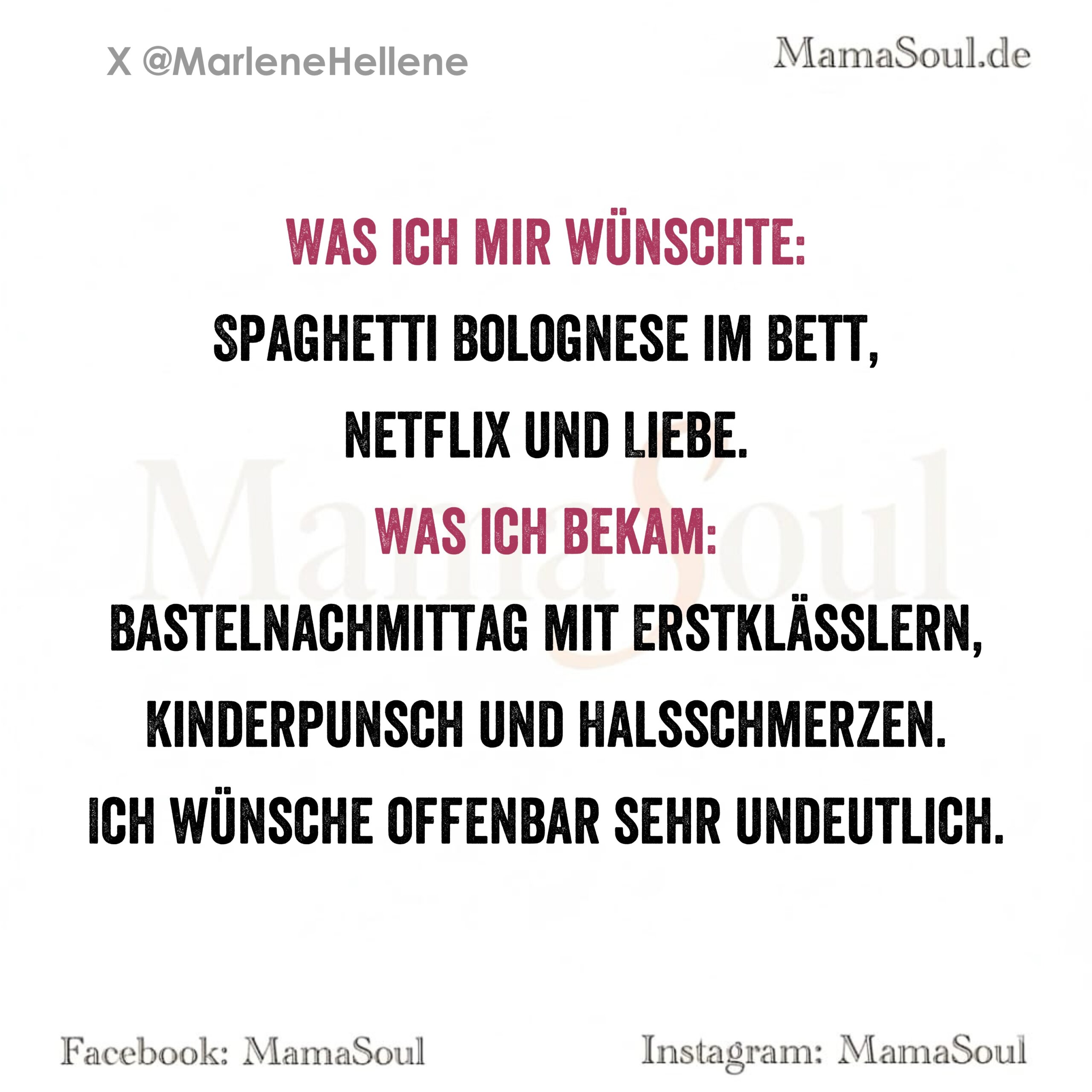 Was ich mir wünschte: Spaghetti Bolognese im Bett, Netflix und Liebe. Was ich bekam: Bastelnachmittag mit Erstklässlern, Kinderpunsch und Halsschmerzen. Ich wünsche offenbar sehr undeutlich.