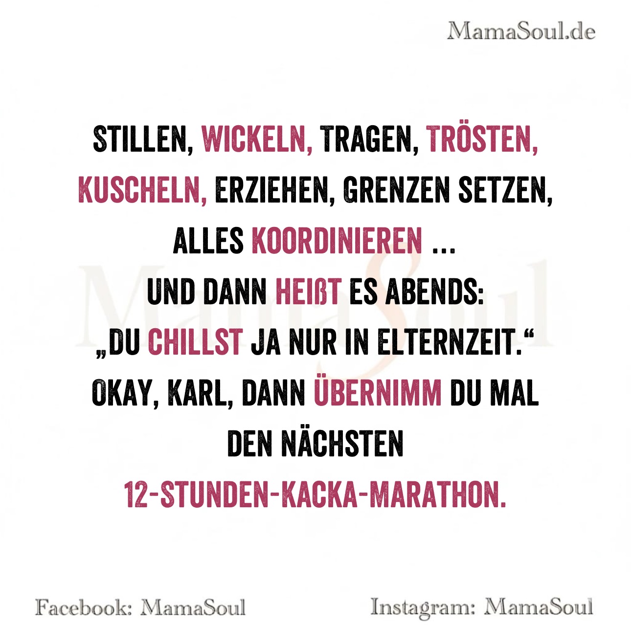 Stillen, Wickeln, Tragen, Trösten, Kuscheln, Erziehen, Grenzen setzen, alles koordinieren … Und dann heißt es abends: „Du chillst ja nur in Elternzeit.“ Okay, Karl, dann übernimm du mal den nächsten 12-Stunden-Kacka-Marathon.