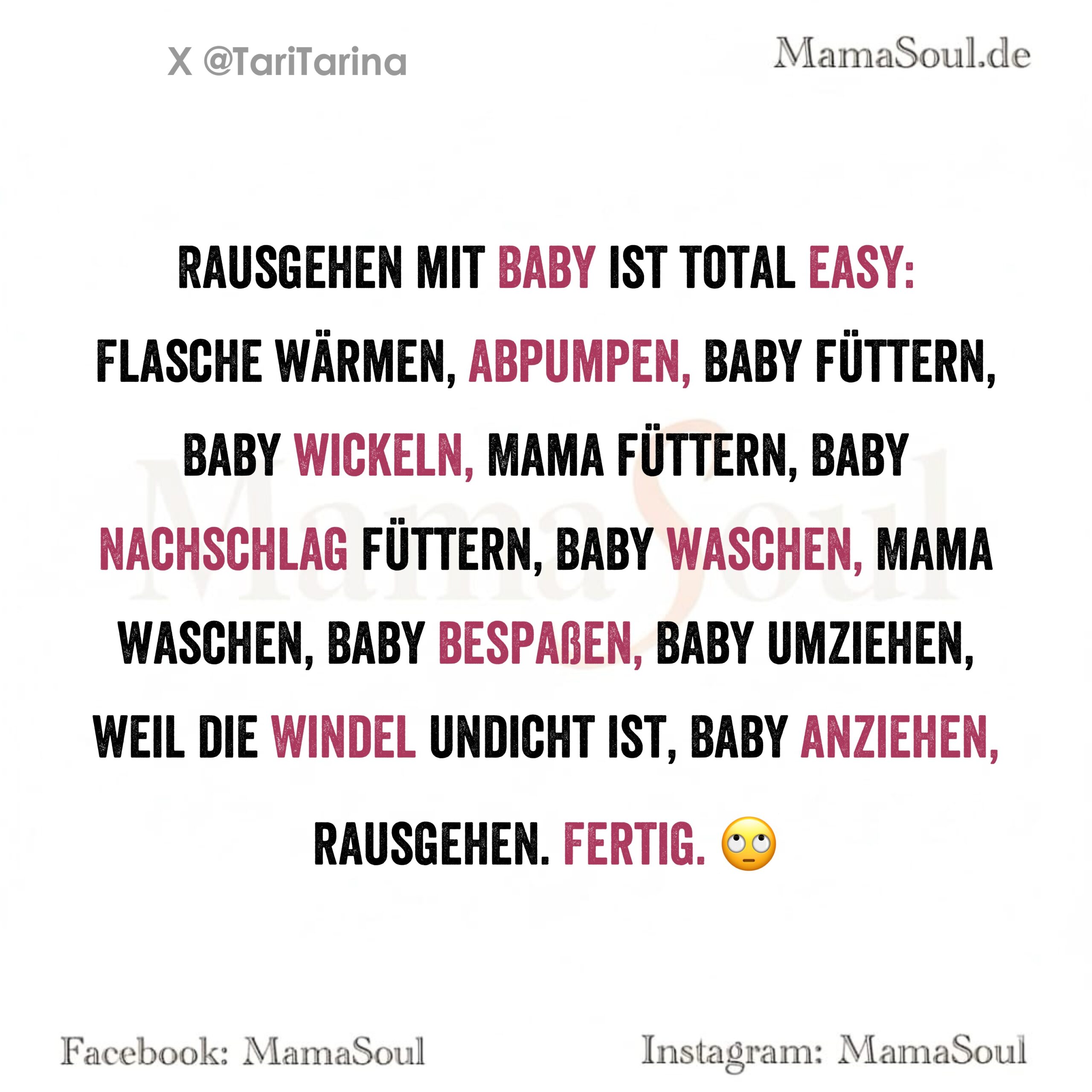 Flasche wärmen, abpumpen, Baby füttern, Baby wickeln, Mama füttern, Baby Nachschlag füttern, Baby waschen, Mama waschen, Baby bespaßen, Baby umziehen, weil die Windel undicht ist, Baby anziehen, rausgehen. Fertig. 🙄