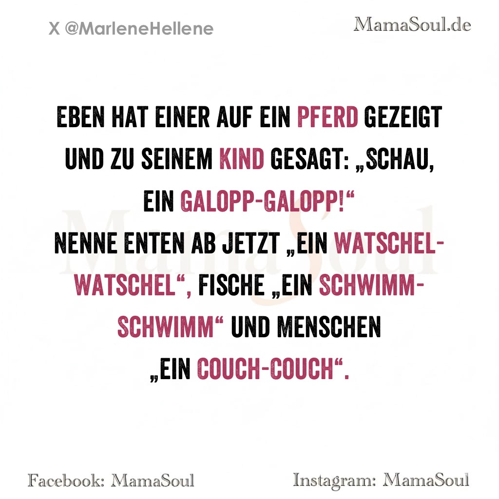 Nenne Enten ab jetzt „ein Watschel-Watschel“, Fische „ein Schwimm-Schwimm“ und Menschen „ein Couch-Couch“.