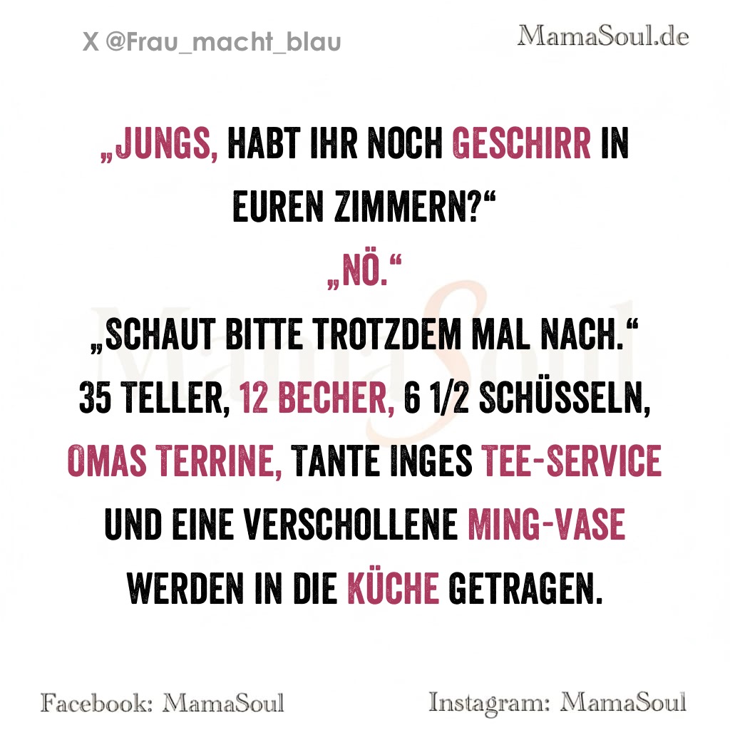 35 Teller, 12 Becher, 6 1/2 Schüsseln, Omas Terrine, Tante Inges Tee-Service und eine verschollene Ming-Vase werden in die Küche getragen.