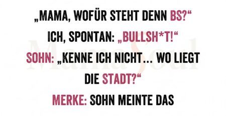 Sohn guckt TV: „Mama, wofür steht denn BS?“ Ich, spontan: „Bullsh*t!“ Sohn: „Kenne ich nicht… wo liegt die Stadt?“ Merke: Sohn meinte das KFZ-Kennzeichen.... read more