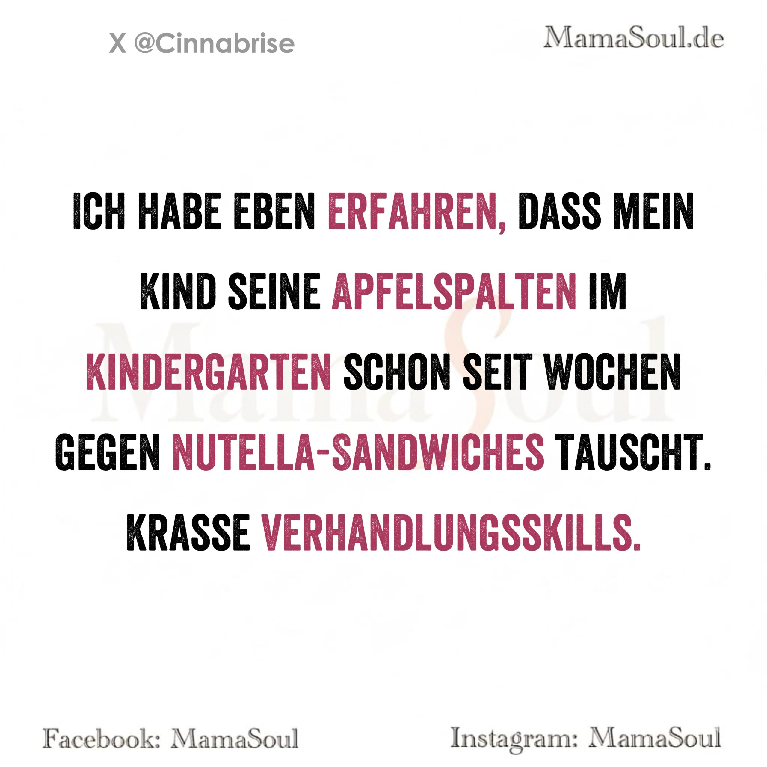 Ich habe eben erfahren, dass mein Kind seine Apfelspalten im Kindergarten schon seit Wochen gegen Nutella-Sandwiches tauscht. Krasse Verhandlungsskills.