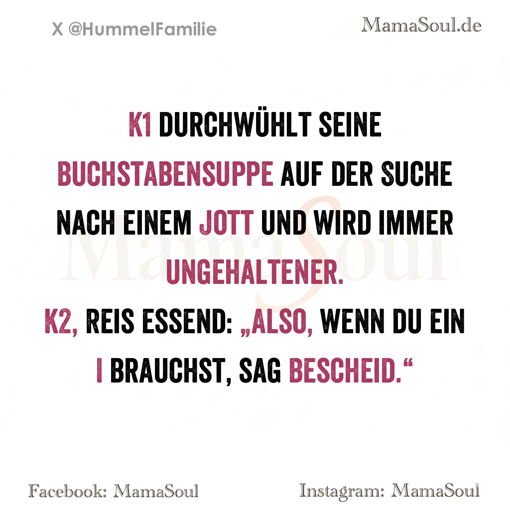 K1 durchwühlt seine Buchstabensuppe auf der Suche nach einem Jott und wird immer ungehaltener.