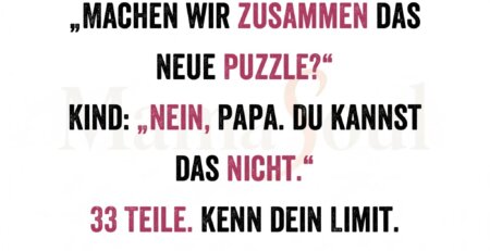 „Machen wir zusammen das neue Puzzle?“ Kind: „Nein, Papa. Du kannst das nicht.“ 33 Teile. Kenn dein Limit. read more