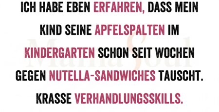 Ich habe eben erfahren, dass mein Kind seine Apfelspalten im Kindergarten schon seit Wochen gegen Nutella-Sandwiches tauscht. Krasse Verhandlungsskills. read more