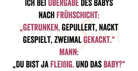 Ich bei Übergabe des Babys nach Frühschicht: „Getrunken, gepullert, nackt gespielt, zweimal gekackt.“ Mann: „Du bist ja fleißig. Und das Baby?“ read more
