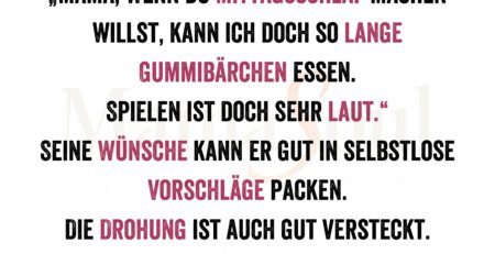 „Mama, wenn du Mittagsschlaf machen willst, kann ich doch so lange Gummibärchen essen. Spielen ist doch sehr laut.“ Seine Wünsche kann er... read more