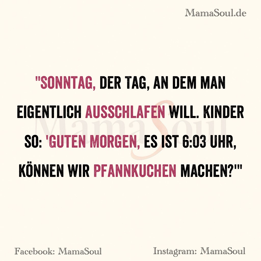 „Sonntag, der Tag, an dem man eigentlich ausschlafen will. Kinder so: ‚Guten Morgen, es ist 6:03 Uhr, können wir Pfannkuchen machen?'“
