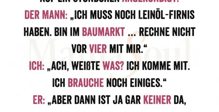 Schwiegermutter hat sich für 15 Uhr auf ein Stündchen angekündigt. Der Mann: „Ich muss noch Leinöl-Firnis haben. Bin im Baumarkt …... read more
