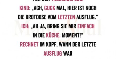 Ich packe mit den Kindern die Rucksäcke für den Tagesausflug. Kind: „Ach, guck mal, hier ist noch die Brotdose vom letzten... read more