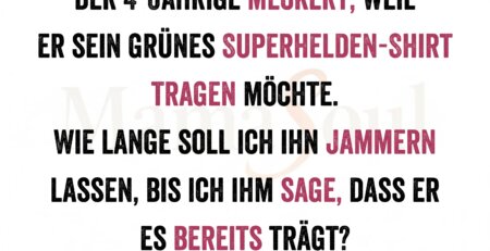 Der 4-Jährige meckert, weil er sein grünes Superhelden-Shirt tragen möchte. Wie lange soll ich ihn jammern lassen, bis ich ihm sage,... read more