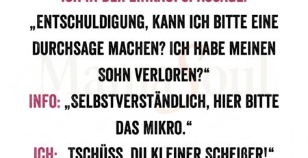Ich in der Einkaufspassage: „Entschuldigung, kann ich bitte eine Durchsage machen? Ich habe meinen Sohn verloren?“ Info: „Selbstverständlich, hier bitte das... read more