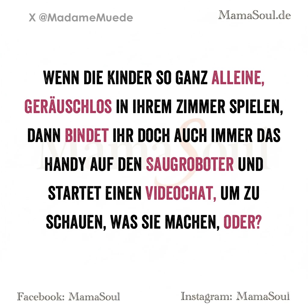 Wenn die Kinder so ganz alleine, geräuschlos in ihrem Zimmer spielen, dann bindet ihr doch auch immer das Handy auf den Saugroboter und startet einen Videochat, um zu schauen, was sie machen, oder?