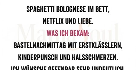 Was ich mir wünschte: Spaghetti Bolognese im Bett, Netflix und Liebe. Was ich bekam: Bastelnachmittag mit Erstklässlern, Kinderpunsch und Halsschmerzen. Ich wünsche offenbar sehr... read more