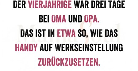 Der Vierjährige war drei Tage bei Oma und Opa. Das ist in etwa so, wie das Handy auf Werkseinstellung zurückzusetzen. read more