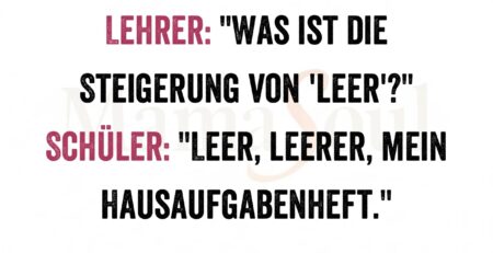 Lehrer: "Was ist die Steigerung von 'leer'?" Schüler: "Leer, leerer, mein Hausaufgabenheft." read more