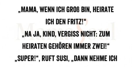 Susi ruft begeistert: „Mama, wenn ich groß bin, heirate ich den Fritz!“ „Na ja, Kind, vergiss nicht: Zum Heiraten gehören immer zwei!“ „Super!“,... read more
