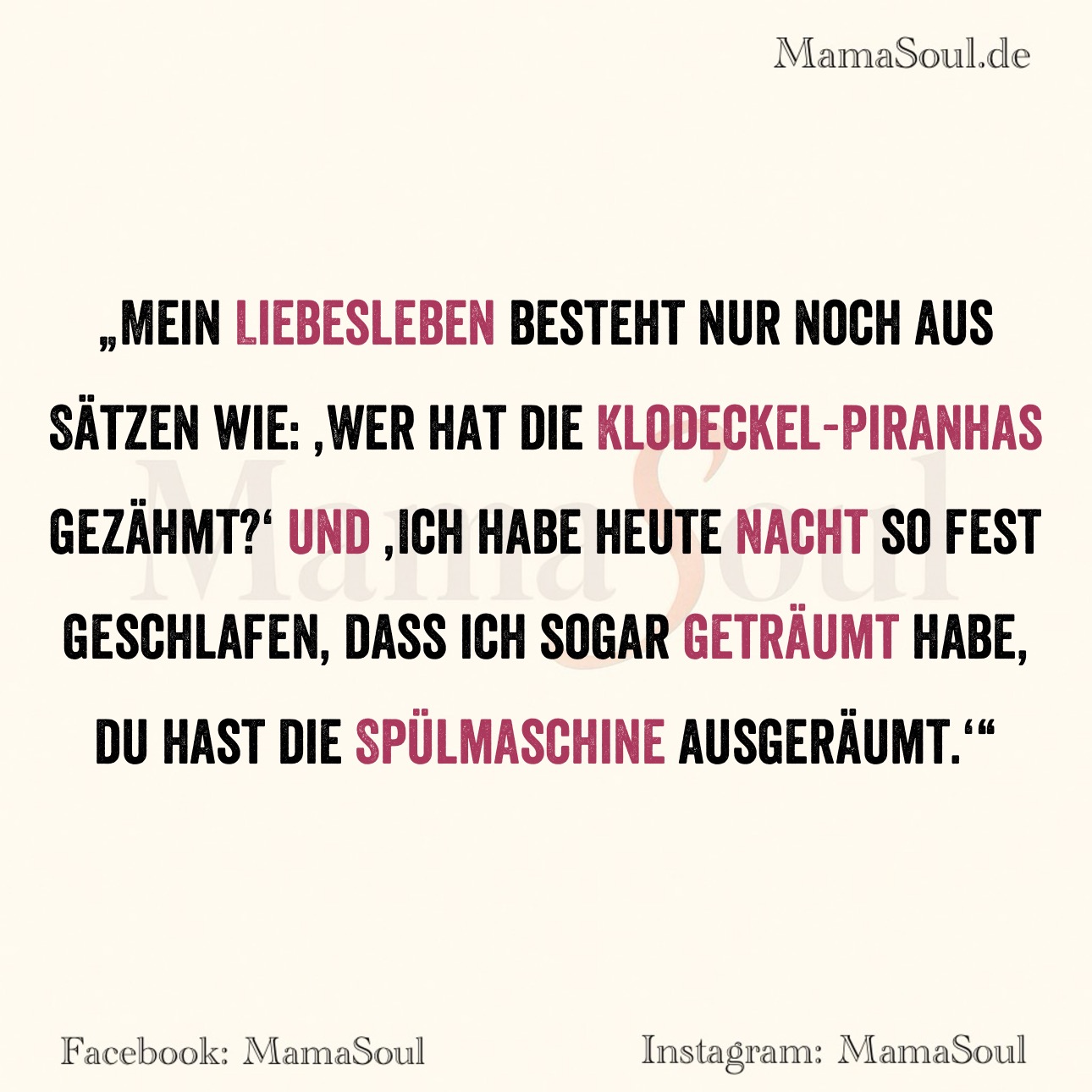 „Mein Liebesleben besteht nur noch aus Sätzen wie: ‚Wer hat die Klodeckel-Piranhas gezähmt?‘ und ‚Ich habe heute Nacht so fest geschlafen, dass ich sogar geträumt habe, du hast die Spülmaschine ausgeräumt.‘“