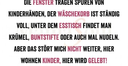 Die Fenster tragen Spuren von Kinderhänden, der Wäschekorb ist ständig voll, unter dem Esstisch findet man Krümel, Buntstifte oder auch... read more