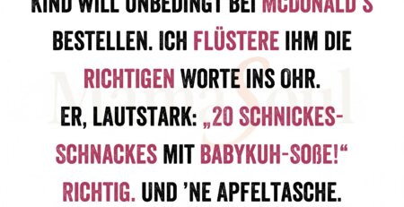 Kind will unbedingt bei McDonald’s bestellen. Ich flüstere ihm die richtigen Worte ins Ohr. Er, lautstark: „20 Schnickes-Schnackes mit Babykuh-Soße!“ Richtig. Und... read more