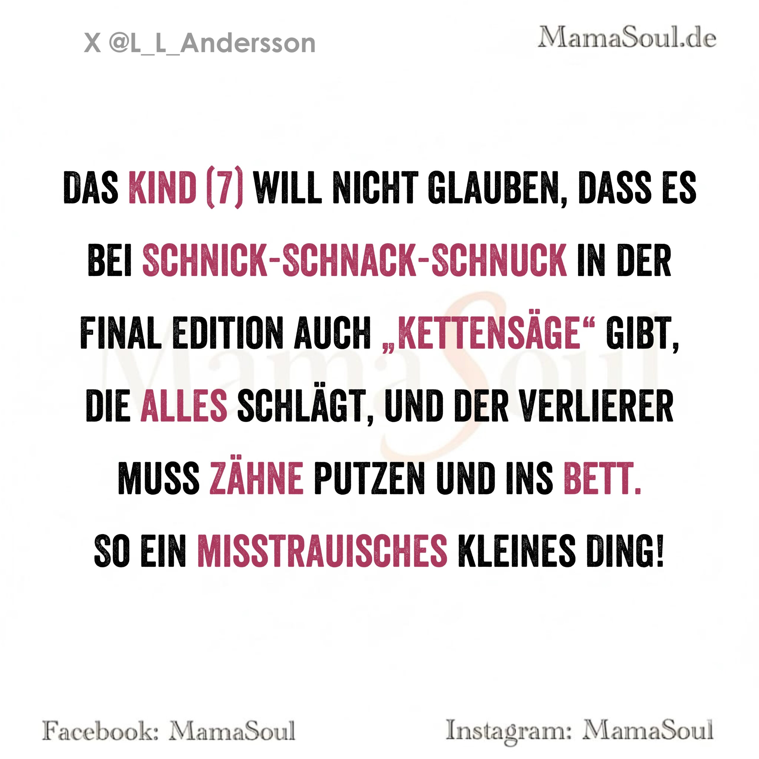 Das Kind (7) will nicht glauben, dass es bei Schnick-Schnack-Schnuck in der Final Edition auch „Kettensäge“ gibt, die alles schlägt, und der Verlierer muss Zähne putzen und ins Bett.
