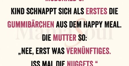 McDonald’s. Kind schnappt sich als Erstes die Gummibärchen aus dem Happy Meal. Die Mutter so: „Nee, erst was Vernünftiges. Iss mal die Nuggets.“ read more