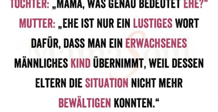 Tochter: „Mama, was genau bedeutet Ehe?“ Mutter: „Ehe ist nur ein lustiges Wort dafür, dass man ein erwachsenes männliches Kind übernimmt,... read more