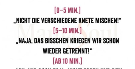Kneten mit Kleinkindern: [0–5 Min.] „Nicht die verschiedene Knete mischen!“ [5–10 Min.] „Naja, das bisschen kriegen wir schon wieder getrennt!“ [ab 10 Min.] „Ach, mir doch... read more