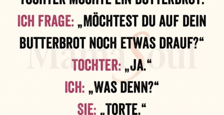Tochter möchte ein Butterbrot. Ich frage: „Möchtest du auf dein Butterbrot noch etwas drauf?“ Tochter: „Ja.“ Ich: „Was denn?“ Sie: „Torte.“ read more