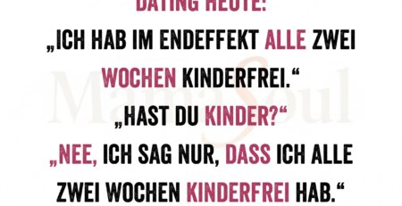 Dating heute: „Ich hab im Endeffekt alle zwei Wochen kinderfrei.“ „Hast du Kinder?“ „Nee, ich sag nur, dass ich alle zwei Wochen kinderfrei... read more