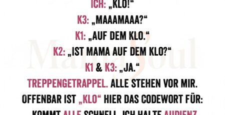 K1 (quer durchs Haus rufend): „Mama?“ Ich: „Klo!“ K3: „Maaamaaa?“ K1: „Auf dem Klo.“ K2: „Ist Mama auf dem Klo?“ K1 & K3: „Ja.“ Treppengetrappel. Alle... read more