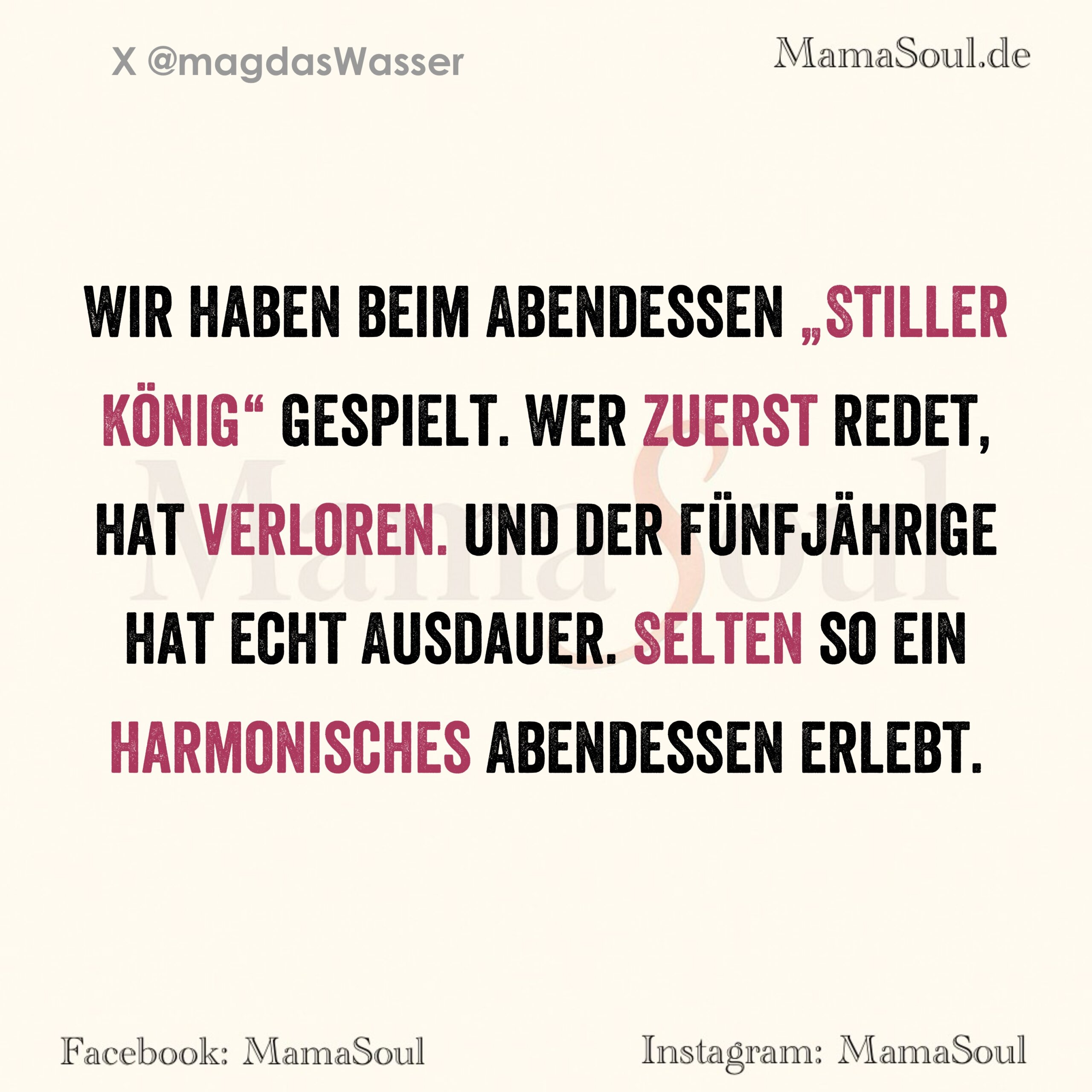 Wir haben beim Abendessen „Stiller König“ gespielt. Wer zuerst redet, hat verloren. Und der Fünfjährige hat echt Ausdauer.