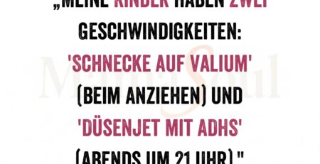 „Meine Kinder haben zwei Geschwindigkeiten: 'Schnecke auf Valium' (beim Anziehen) und 'Düsenjet mit ADHS' (abends um 21 Uhr)." read more