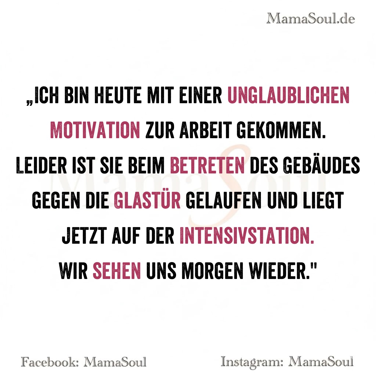 „Ich bin heute mit einer unglaublichen Motivation zur Arbeit gekommen. Leider ist sie beim Betreten des Gebäudes gegen die Glastür gelaufen und liegt jetzt auf der Intensivstation. Wir sehen uns morgen wieder.“