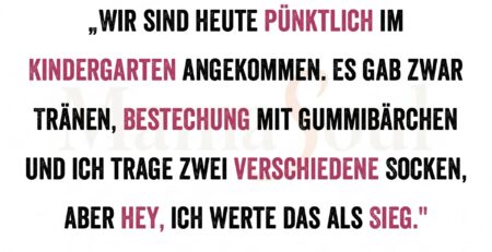„Wir sind heute pünktlich im Kindergarten angekommen. Es gab zwar Tränen, Bestechung mit Gummibärchen und ich trage zwei verschiedene Socken,... read more