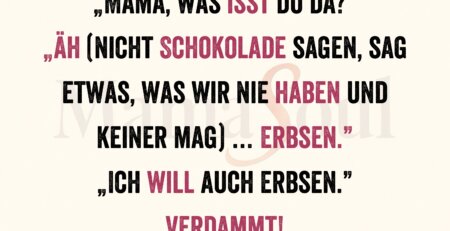 „Mama, was isst du da?” „Äh (nicht Schokolade sagen, sag etwas, was wir nie haben und keiner mag) … Erbsen.” „Ich will... read more