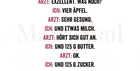 Arzt: Was hatten Sie zum Frühstück? Ich: Zwei Eier. Arzt: Exzellent. Was noch? Ich: Vier Äpfel. Arzt: Sehr gesund. Ich: Und etwas Milch. Arzt: Hört sich... read more