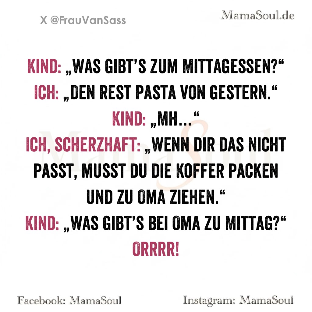 Ich, scherzhaft: „Wenn dir das nicht passt, musst du die Koffer packen und zu Oma ziehen.“