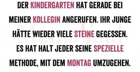 Der Kindergarten hat gerade bei meiner Kollegin angerufen. Ihr Junge hätte wieder viele Steine gegessen. Es hat halt jeder seine spezielle... read more