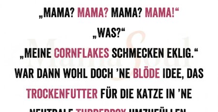 Kind weckt mich. „Mama? Mama? Mama? Mama!“ „Was?“ „Meine Cornflakes schmecken eklig.“ War dann wohl doch ’ne blöde Idee, das Trockenfutter für die Katze... read more