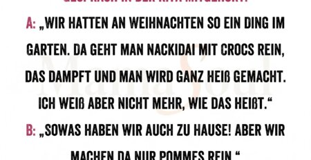 Gespräch in der Kita mitgehört: A: „Wir hatten an Weihnachten so ein Ding im Garten. Da geht man nackidai mit Crocs... read more