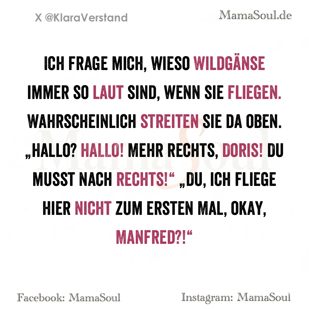 Ich frage mich, wieso Wildgänse immer so laut sind, wenn sie fliegen. Wahrscheinlich streiten sie da oben. „Hallo? HALLO! Mehr rechts, Doris! Du musst nach rechts!“ „Du, ich fliege hier nicht zum ersten Mal, okay, Manfred?!“