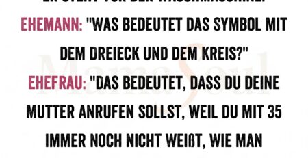 Er steht vor der Waschmaschine. Ehemann: "Was bedeutet das Symbol mit dem Dreieck und dem Kreis?" Ehefrau: "Das bedeutet, dass du deine... read more